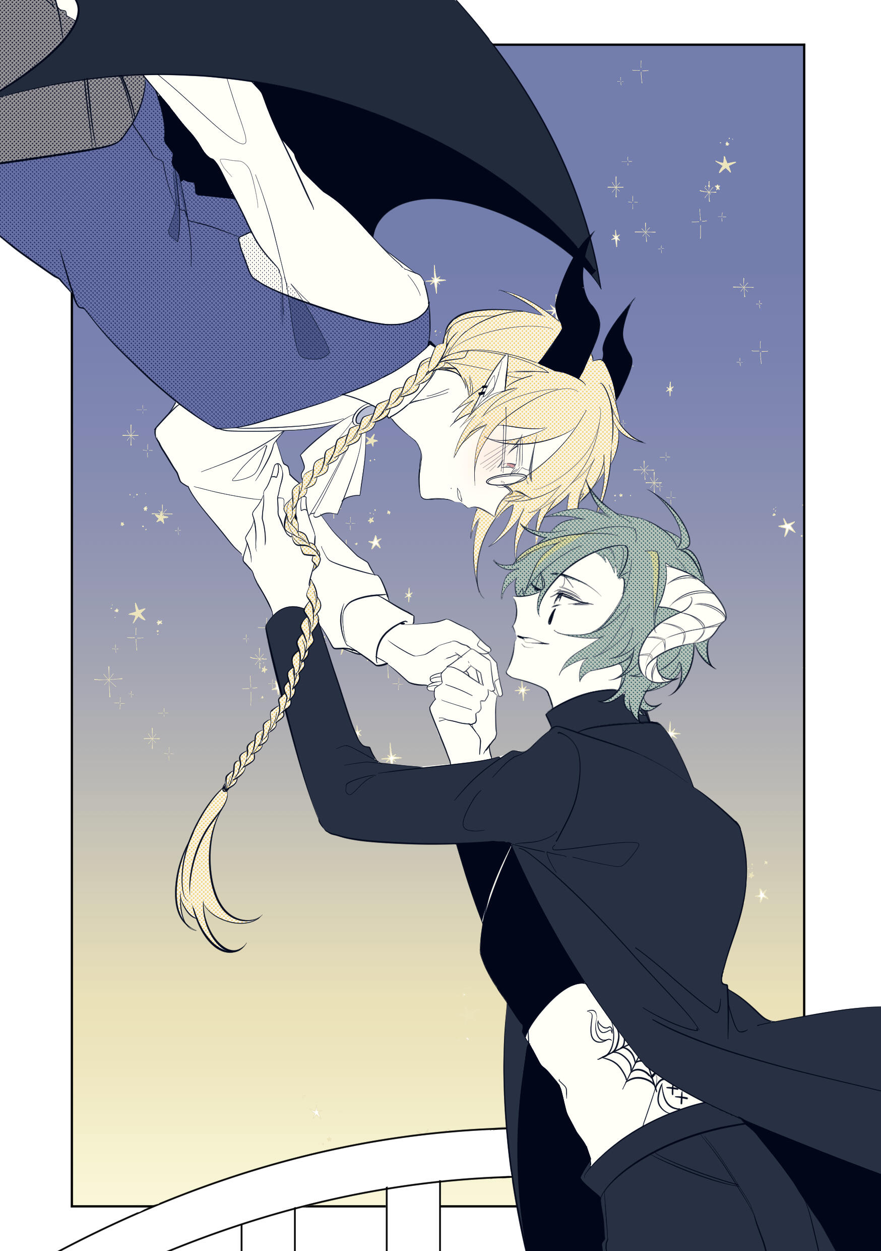 徐徐微風拂過大窄邸的花園,園中的粉藍色玫瑰迎風搖曳,薄透的雪色紗簾亦跟著揚起,朦朧了落地窗前男子纖細而高挑的身影。自打一早目送四個孩子離開宅邸前往城區工作,涅便一直維持著同一個姿勢釘在原地,猶如一座文藝復興時期的精美仙子雕像。也不知過了多久,忽然一名少女模樣的女人背著雙手俏皮的從男子身後探了出來,「小水母看起來好像一個老父親喔!」靈動的大眼透露著絲絲的壞,擺明了是在笑話涅呢!若非對女子有所了解,她那鄰家女孩的可愛模樣,只怕旁人看了都會誤以為她還是讀著隔壁四區學院的學生,絕對不會有人能聯想到女子已經活了三個世紀之久,實際年齡甚至還比身旁的男子上大上百餘歲。雖說骸至今對許多情緒仍舊難以辨識,更別說是理解,但就憑著他們之間那特殊的連結,骸還是嗅到了涅那驀然回首之際對生命成長的感嘆和不意察覺的隱隱惆悵。「天還早呢,怎麼就喝酒了呢?」回過身,涅寵溺的捧上骸因酒氣而有些暈紅的臉蛋。依涅對骸的了解,黃昏時喝點小酒享受夕陽餘暉是情調,但在這個時間點飲酒為實有些反常了,除非……「實驗的魔法咒語對不上,我就想說喝一點酒看看能不能想通嘛……」或許是喝的多了,骸的咬字開始有些含糊不清,可看在涅眼裡卻莫名有種嬌憨之感。涅明白骸有興趣鑽研的魔法大多都是複雜而繁瑣具挑戰性的類型,往往一個小細節不對,魔法便無法引動,若想成功那所需要耗費的精力可想而知。就在涅思緒飄飛時,骸突然孩子氣的蹭了蹭那捧著自己的溫暖掌心,嘴裏輕聲呢喃著:「小水母……」被骸突如其來的舉動一驚,涅小心翼翼的微微移開自己貼著粉嫩臉蛋的掌,就怕指根上有些稜角的戒指刮傷了骸細嫩的肌膚。意識到了涅的閃躲,骸不依的再度蹭了上去,而涅又一次的重複方才的動作。「嗯……小水母不喜歡我嗎?」骸一雙略為失焦的大眼撲扇著,也不知是因爲酒精的作用,還是因為委屈的氤氳使然…….「才沒有呢……」涅溫柔的嗓音有著無奈,但更多的是無法抑制的憐愛,「我只是怕戒指刮傷妳……」